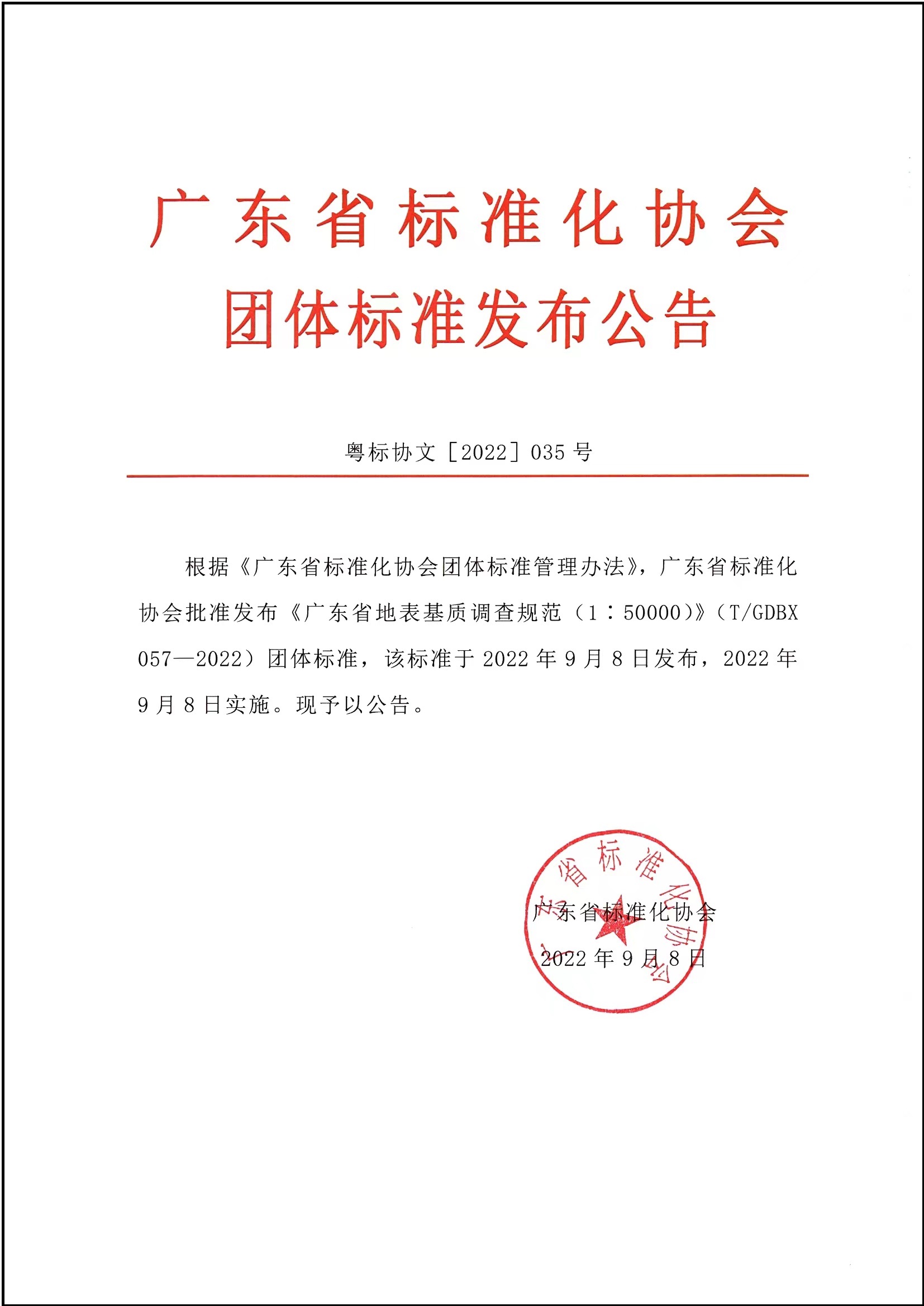 根据《广东省标准化协会团体标准管理办法》,广东省标准化协会批准发布《广东省地表基质调查规范(1∶50000)》(T/GDBX 057—2022)团体标准,该标准于2022年9月8日发布,2022年9月8日实施。现予以公告。