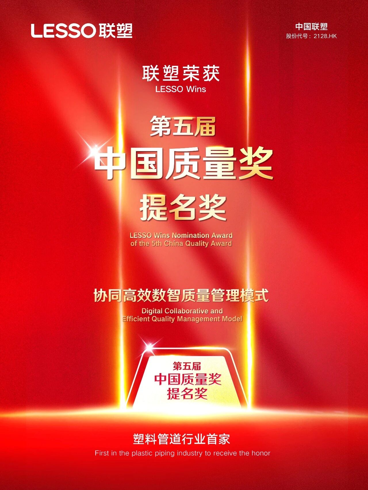 中国质量奖是经中央批准的质量领域最高荣誉,面向全国各行业,旨在推广科学质量管理制度,助力质量强国建设。此次获奖,是国家和政府对联塑质量管理成果及在智能制造与高质量发展中突出贡献的高度认可。