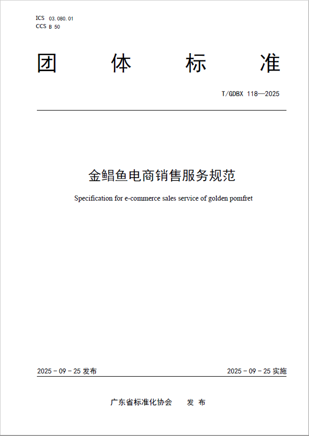 T/GDBX 118—2025 金鲳鱼电商销售服务规范 2025-09-25 12:36 来源: + 打印 【字体: 大 中 小 】 上一篇:T/GDBX 119—2025 金鲳鱼加工产业园区建设指南 下一篇:T/GDBX 117—2025 金鲳鱼初加工规范