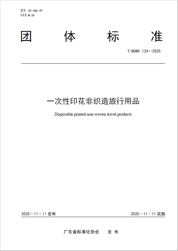 T/GDBX 124—2025 一次性印花非织造旅行用品 2025-11-11 09:51 来源: + 打印 【字体: 大 中 小 】 上一篇:T/GDBX 125—2025 传统香云纱服装 下一篇:T/GDBX 123—2025 窄带卫星天地一体化多媒体数据传输系统技术要求
