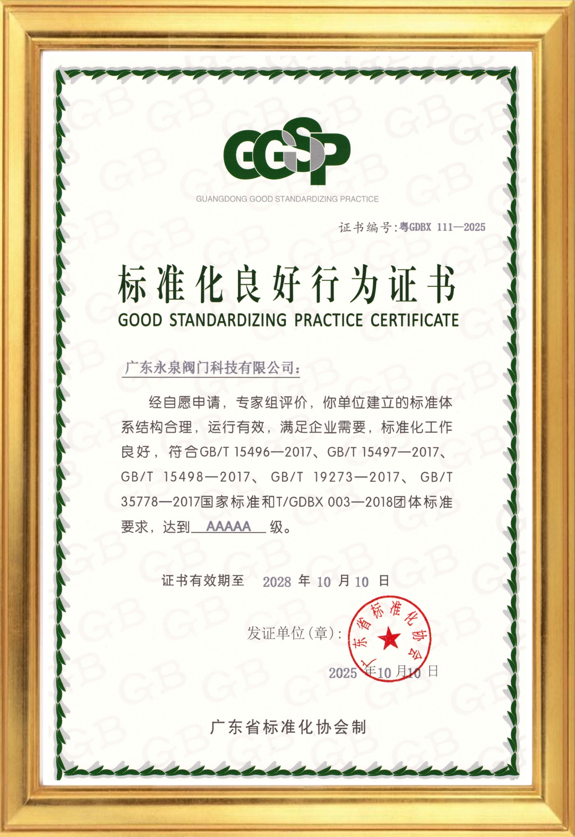 广东永泉阀门科技有限公司通过标准化良好行为AAAAA级企业复审