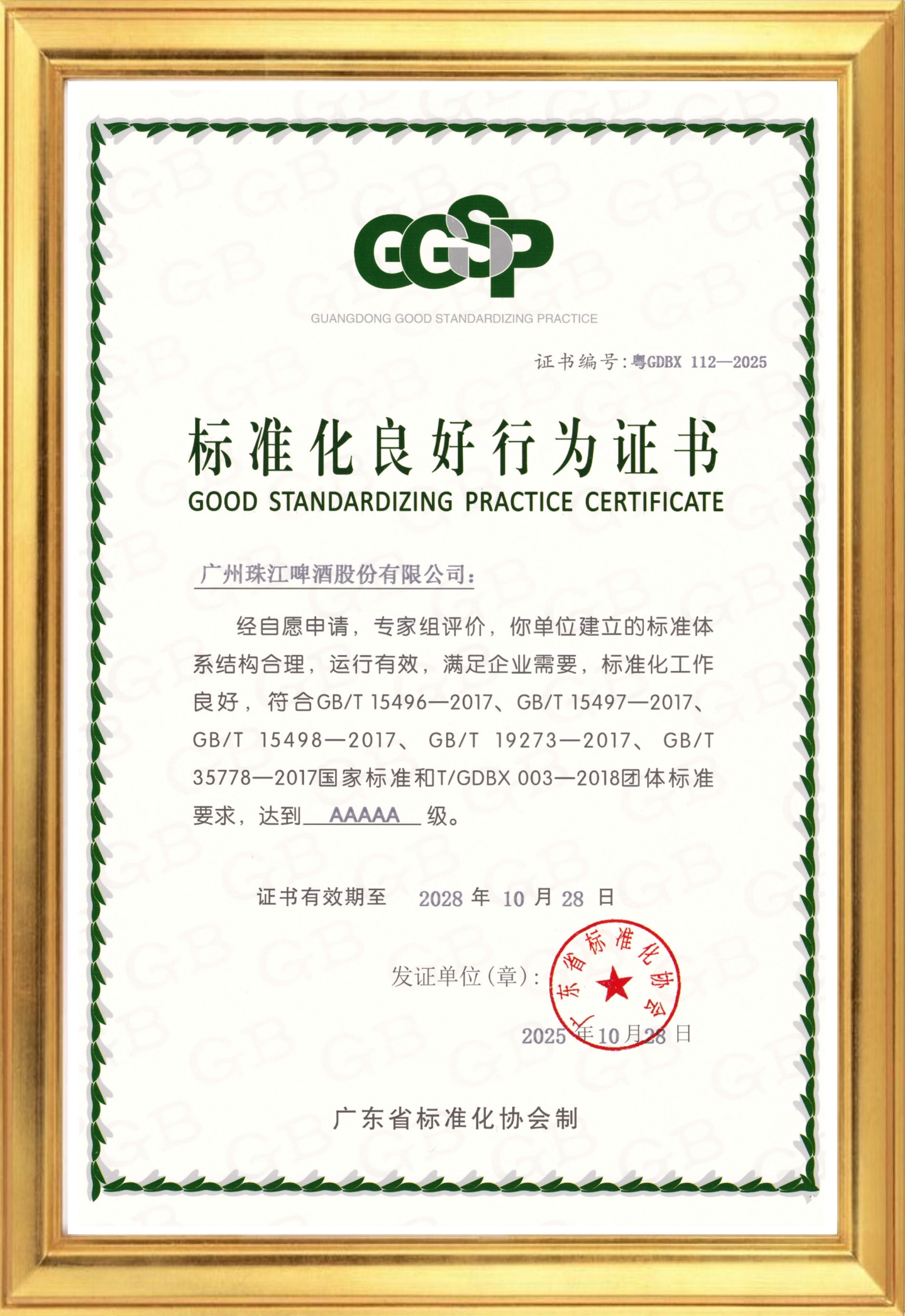 依据《企业标准体系》系列国家标准(GB/T 15496—2017、GB/T 15497—2017、GB/T 15498—2017、GB/T 19273—2017、GB/T 35778—2017)和广东省标准化协会团体标准T/GDBX 003—2018,在企业自愿申报的基础上,经专家组评价确认,广州珠江啤酒股份有限公司通过标准化良好行为AAAAA级企业复审。
