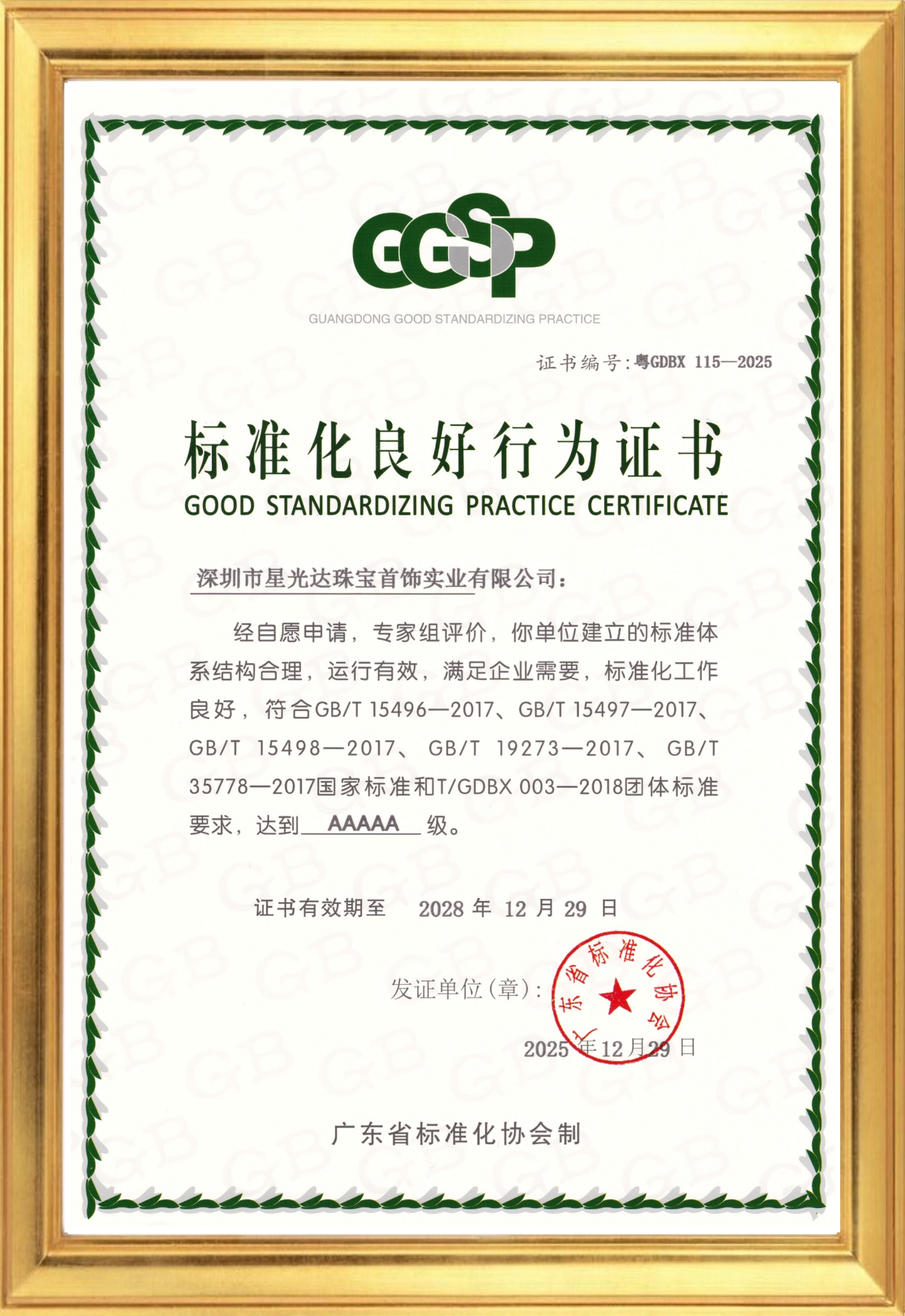 依据《企业标准体系》系列国家标准(GB/T 15496—2017、GB/T 15497—2017、GB/T 15498—2017、GB/T 19273—2017、GB/T 35778—2017)和广东省标准化协会团体标准T/GDBX 003—2018,在企业自愿申报的基础上,经专家组评价确认,深圳市星光达珠宝首饰实业有限公司通过标准化良好行为AAAAA级企业复审。